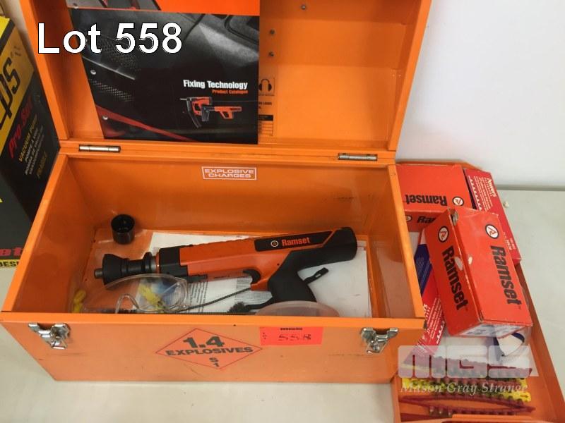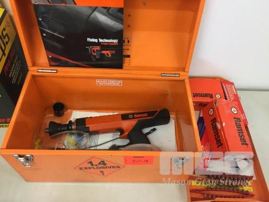 RAMSET EXPLOSIVE FIXING GUN, IN TOOLBOX WITH CHARGERS, BOOKS & SERVICE GEAR