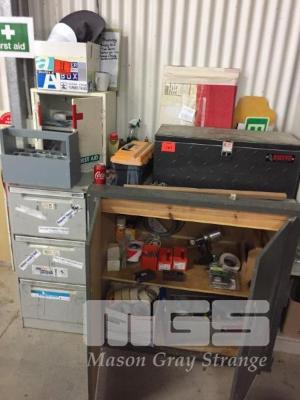 2 DOOR LOWLINE TIMBER CUPBOARD, TOOLBOX, RHINO 3 DRAWER STEEL FILING CABINET & CONTENTS, FIRST AID KIT, TOOLS & HARDWARE