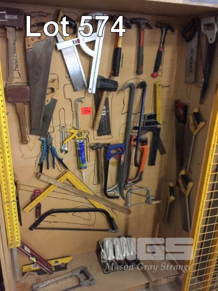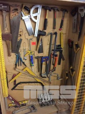 SHADOWBOARD OF TOOLS:- HAND SAWS, LEVELS, SQUARES, WOOD PLANES, PINCH BARS, HAMMERS & MALLETS