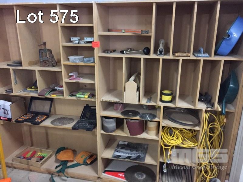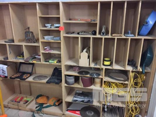 CONTENTS SHELF:- PIPE VICE, SAW BLADES, HAND TOOLS, TOOL BELTS, SANDING PAPER, DRIVER SET, FILES, HARDWARE