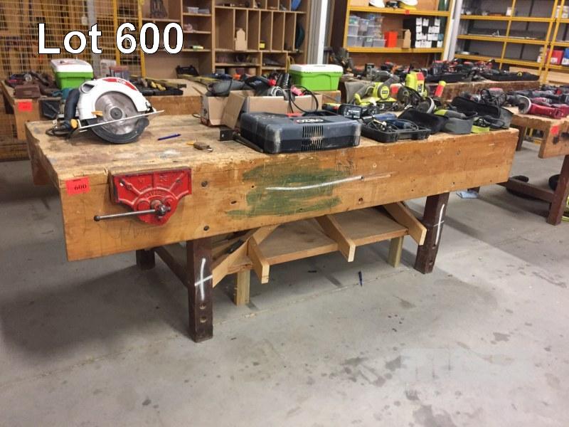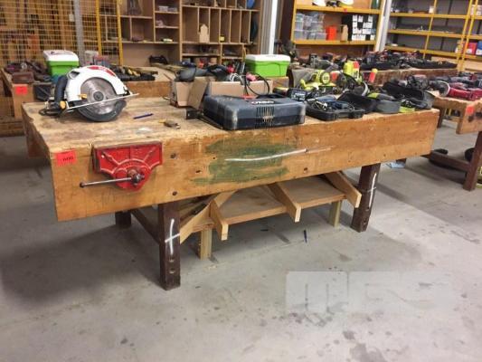 DOUBLE SIDED TIMBER WORKBENCH & 2 WOOD VICES, 2440 x 900mm