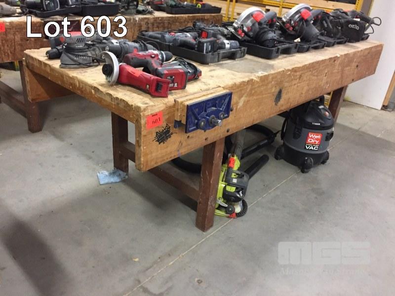 DOUBLE SIDED TIMBER WORKBENCH & 2 WOOD VICES, 2440 x 900mm