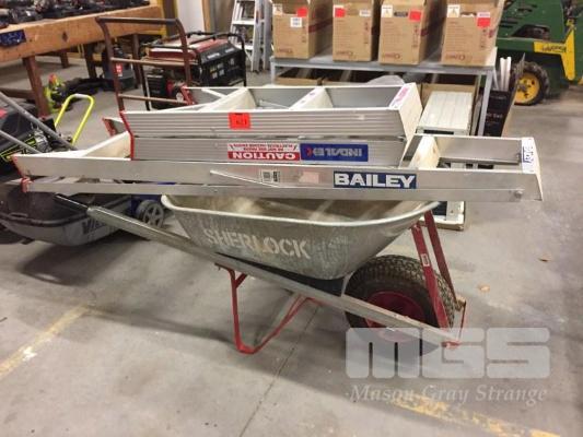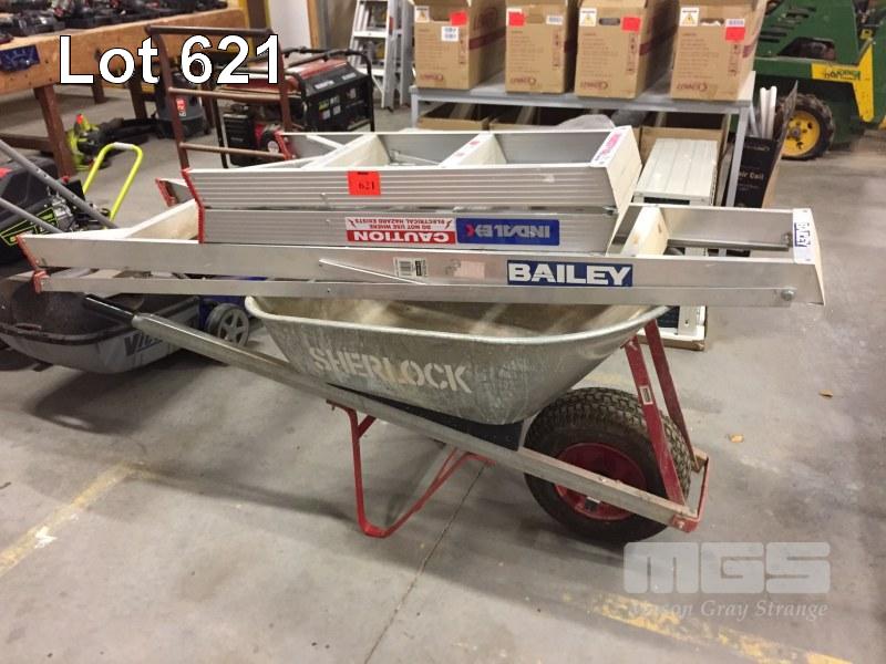 BUILDERS WHEELBARROW GALV TUB & 2 x ALUMINUM STEP LADDERS, BAILEY & INDALEX, 1.8m & 1.0m