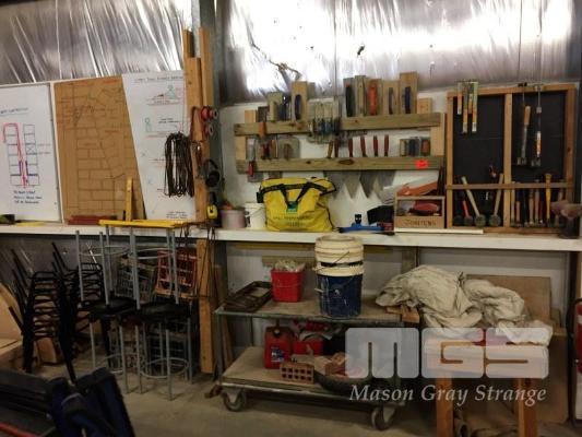 2 x BAYS CONTENTS, HAND TOOLS, MALLET, CONCRETE TROWELS, FUEL CAN, STOOLS, EAR MUFFS, QUANTITY R10 BAR, TROLLEY & 2 x DESKS