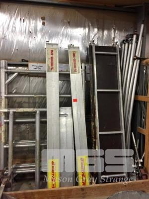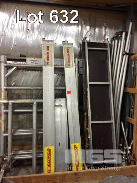 ALLOY 'MR SCAFFOLD' SCAFFOLD SET:- 4 x UPRIGHTS @ 2.1m x 1.35m 2 x UPRIGHTS @ 0.9m x 1.35m 2 x KICK BOARDS @ 2.38m 2 x FLOOR STANDS, WITH HATCH @ 2.50m 15 x BRACE BARS 4 x SWIVEL CASTORS