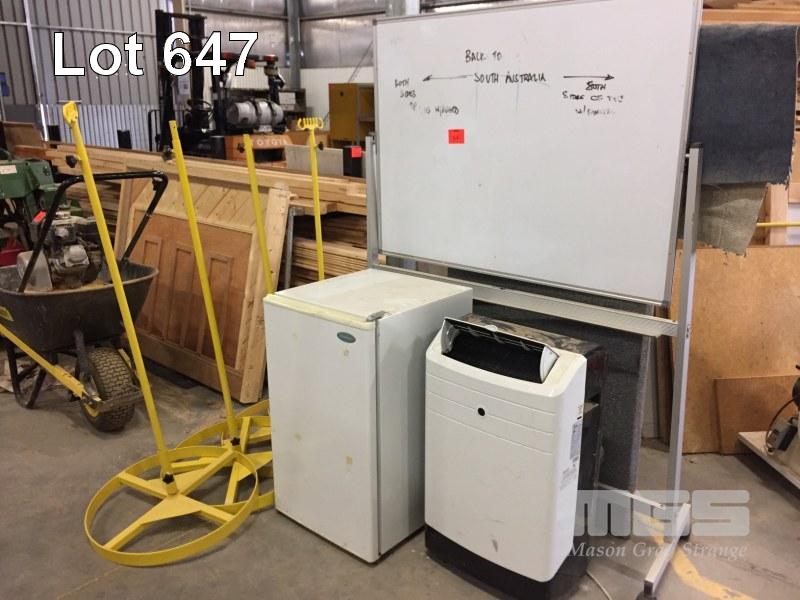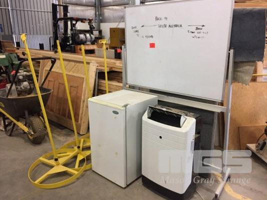 WHITEBOARD, 1200 x 900mm, ON STAND PORTABLE A/C BAR FRIDGE, 4 x CABLE STANDS