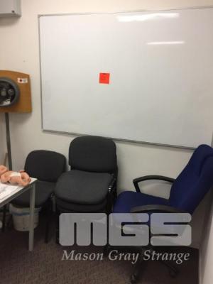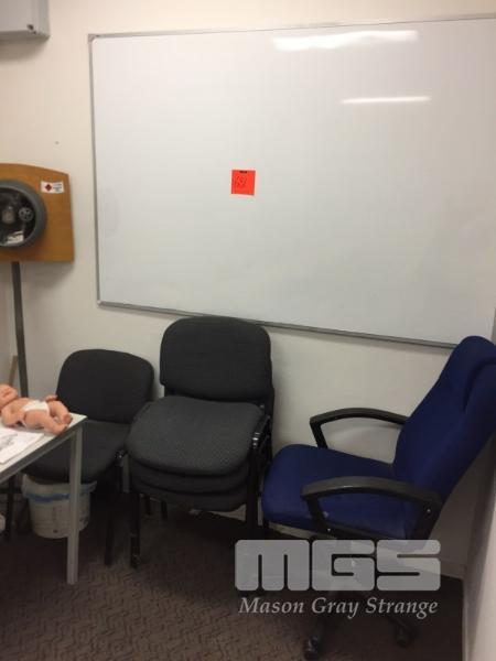 WHITEBOARD, 1800 x 1200mm 4 x TABLES, GREY LAMINATE, 1800 x 900mm 3 x TABLES, GREY LAMINATE, 1200 x 600mm 10 x ASSORTED CHAIRS PLUS 2 x TABLES & CHAIR (IN OUTER ROOM)