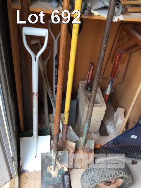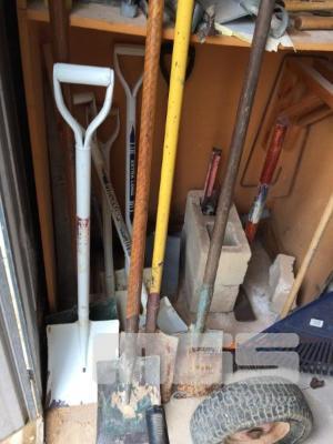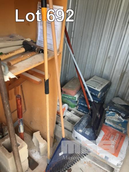 PALLET CONCRETE MIX, 2 x RACKS & CONTENTS OF SHELF, STAR DROPPERS, SHOVELS, PICKS & RAKES