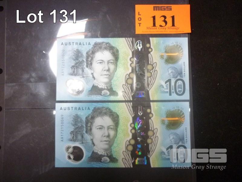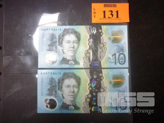 2 X CONSECUTIVE, AUSTRALIA, $10, POLYMER, BANKNOTES, AA 172150069-070