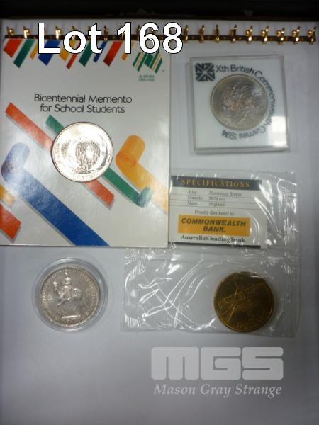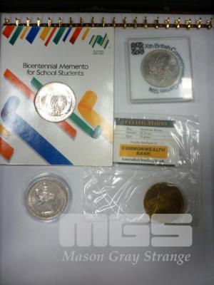 4 X COMMEMORATIVE COINS, INC; UK 1953 FIVE SHILLINGS, NEW ZEALAND 1974 COMMONWEALTH GAMES DOLLAR, AUSTRALIA 1988 FIVE DOLLAR & BICENTENNIAL MEMENTO FOR SCHOOL STUDENTS