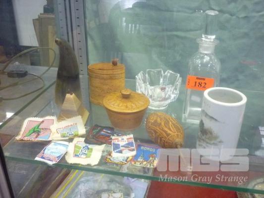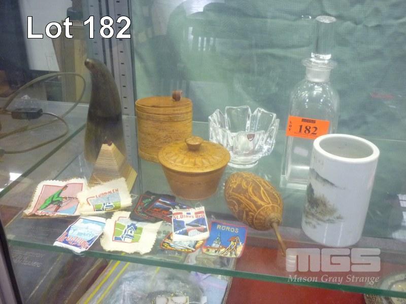 ASSORTED TREEN, CRYSTALWARE, CHINESE PORCELAIN, HORN, CARVED STONE PYRAMID & CLOTH BADGES