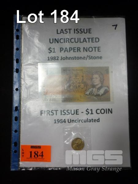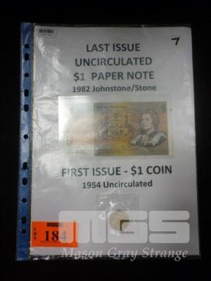 LAST ISSUE,1982, AUSTRALIA, $1 PAPER BANKNOTE & FIRST ISSUE 1984, $1 COIN, JOHNSTONE/STONE DLB143401