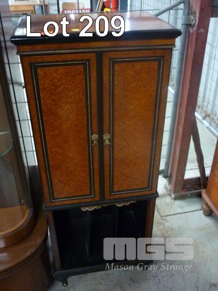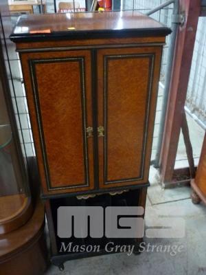 BUR WALNUT VENEER RECORD CABINET, 'THE LANCASTER LONDON' HALLMARK STICKER, 2 DOORS, BRASS CASTORS