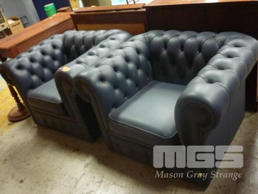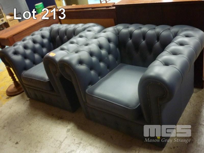 PAIR BLUE CHESTERFIELD STYLE ARMCHAIRS, DEEP BUTTON, ROLL ARM