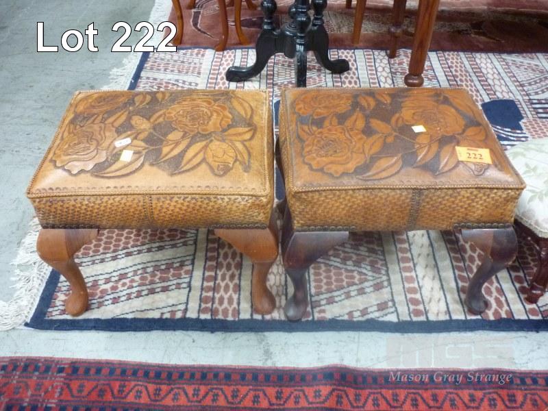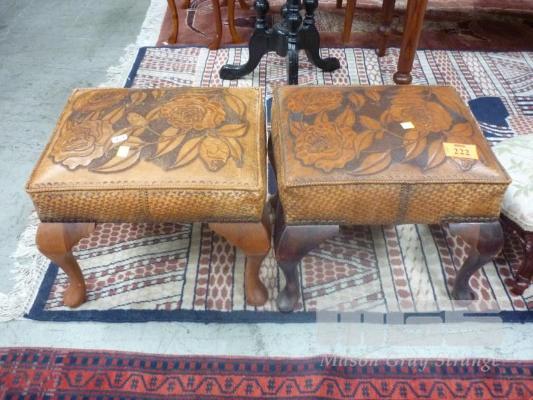 PAIR TIMBER, EMBOSSED LEATHER FOOT RESTS