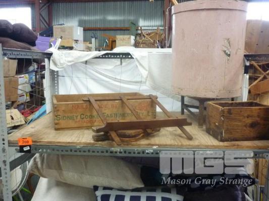 VINTAGE TIMBER BOXES, BELLOWS & MUSIC STAND