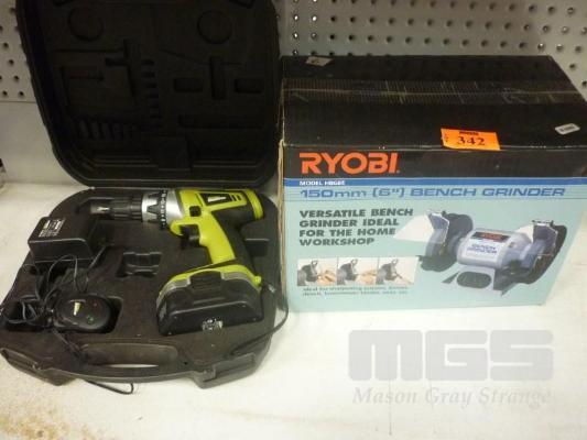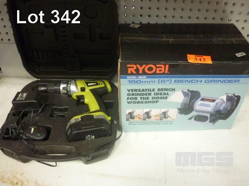ROCKWELL CORDLESS DRILL, IN CASE & RYOBI 6" BENCH GRINDER