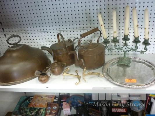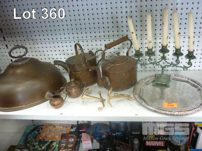 ASSORTED BRASSWARE, METAL CANDELABRA ETC