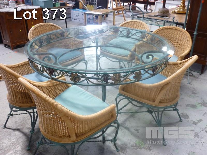 DINING SUITS, 7 PIECE, WROUGHT IRON, AQUA STRESSED PAINT, ROUND GLASS TOP TABLE & 6 x IRON/WICKER CHAIRS