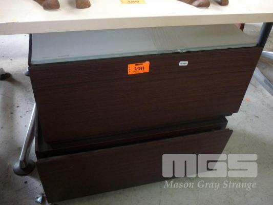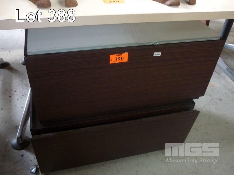 PAIR WOODGRAIN LAMINATE LOWLINE GLASS TOPPED DRAWER UNITS (1 x DRAWER - ALL FAULTS)