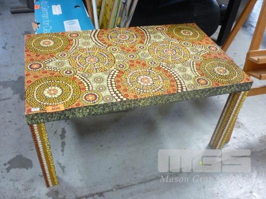COFFEE TABLE, WITH HAND PAINTED INDIGENOUS ARTWORK SIGNED 'EY KERINGKE ARTS, SANTA TERESA, N.T 2000'