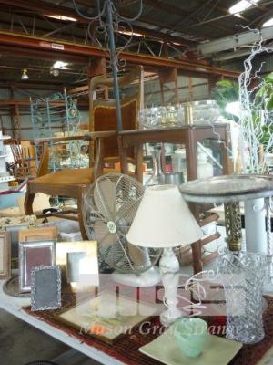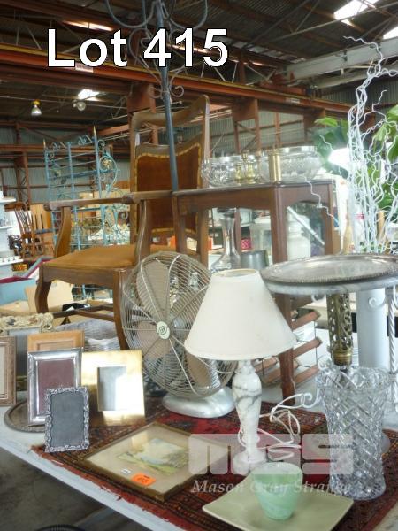 VINTAGE DECOR LOT, CARVER CHAIR, LAMP, VASES, PICTURE FRAMES, FAN & CANDELABRA ETC