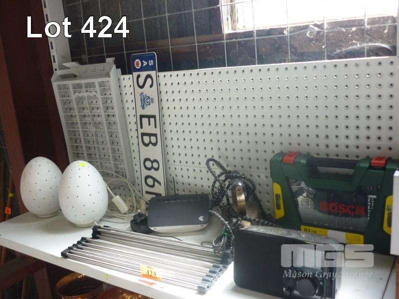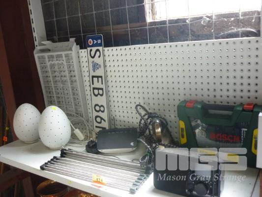 PAIR TABLE LAMPS, VINTAGE IRON, BOSCH TOOL KIT, CLOCK RADIO ETC