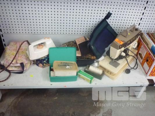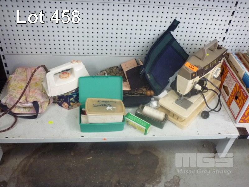 ASSORTED SEWING SUNDRIES, SEWING MACHINE, IRON