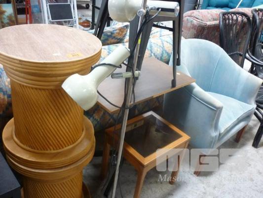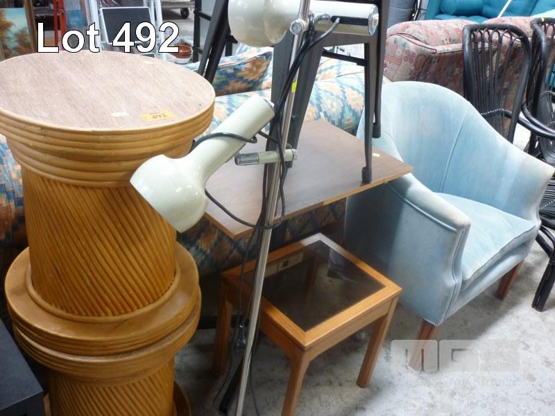 8 x PIECES FURNITURE, CANE PEDESTALS, METAL STOOLS, MOBILE TABLE, SIDE TABLE, TUB CHAIR (STAINED) & STANDARD LAMP