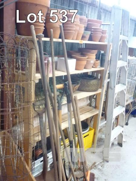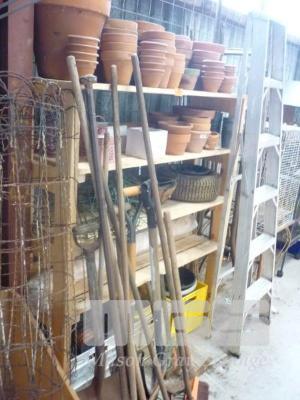 SHED LOT, TIMBER SHELVES, TERRACOTTA POTS, LADDERS, TOOLS ETC