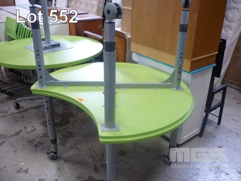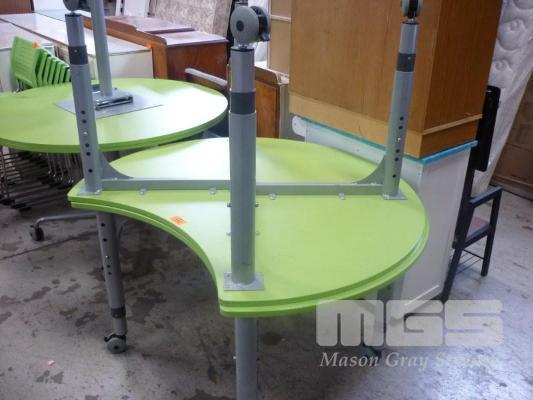 PAIR OF GREEN LAMINATE, CRESCENT MOON SHAPE, MOBILE TABLES, ADJUSTABLE LEGS