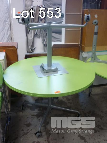 PAIR OF GREEN LAMINATE, ROUND, MOBILE, TABLES