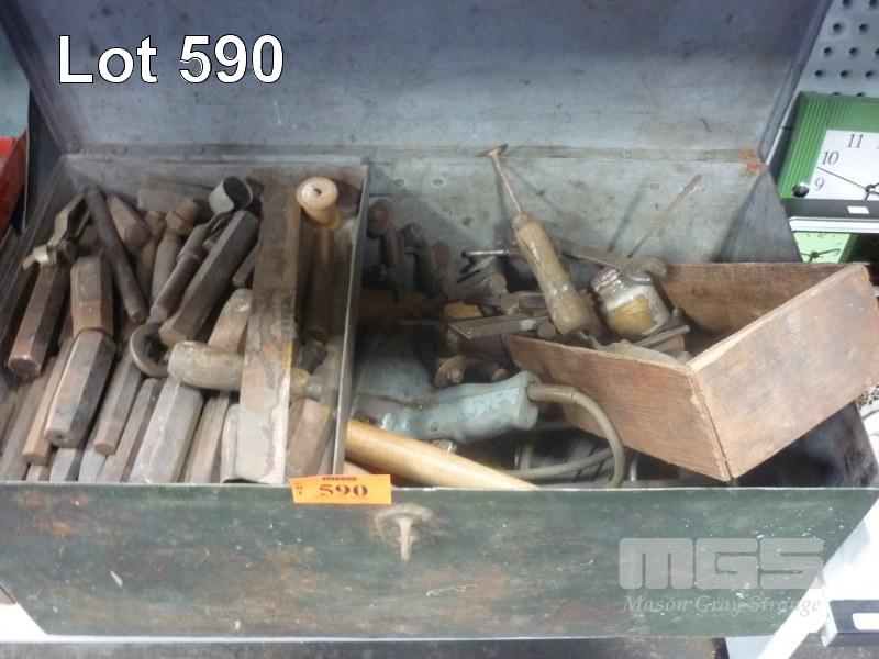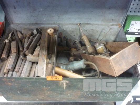 METAL TOOL BOX WITH CONTENTS OF EARLY HAND TOOLS