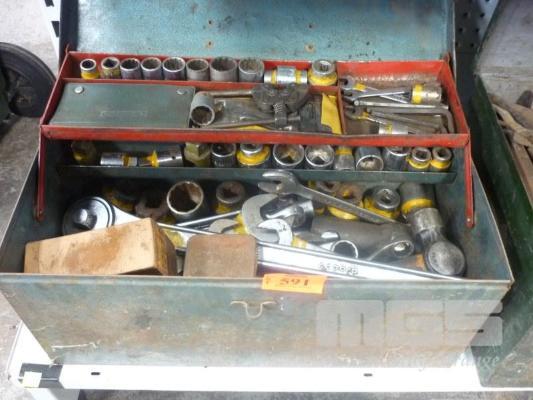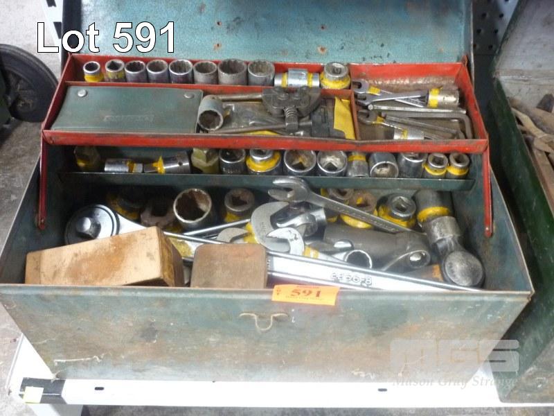 METAL TOOL BOX WITH CONTENTS OF EARLY AUSTRALIAN SIDCHROME SOCKET SET, RING & OPEN END SPANNERS, ETC