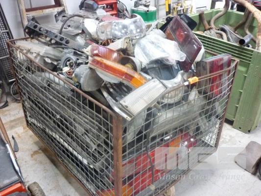 METAL TROLLEY WITH ASSORTED CAR PARTS, LIGHTING, GRILLS ETC