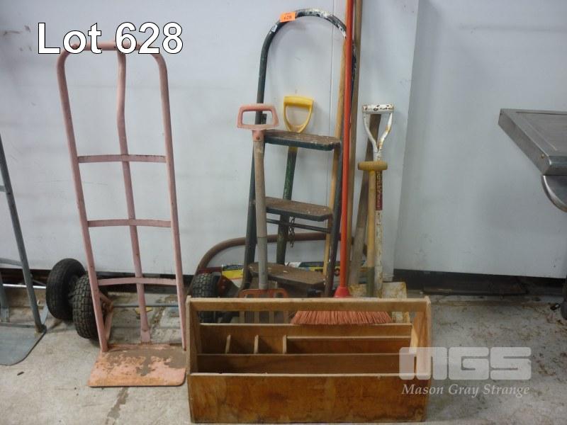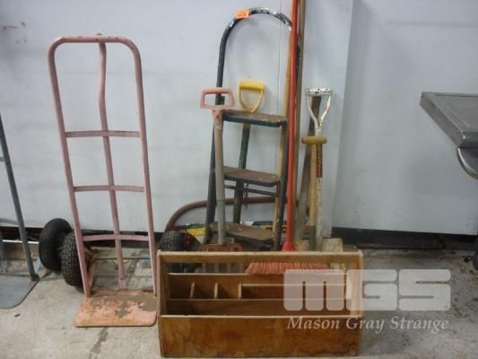 ASSORTED GARDEN TOOLS, STEP LADDER ETC