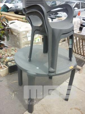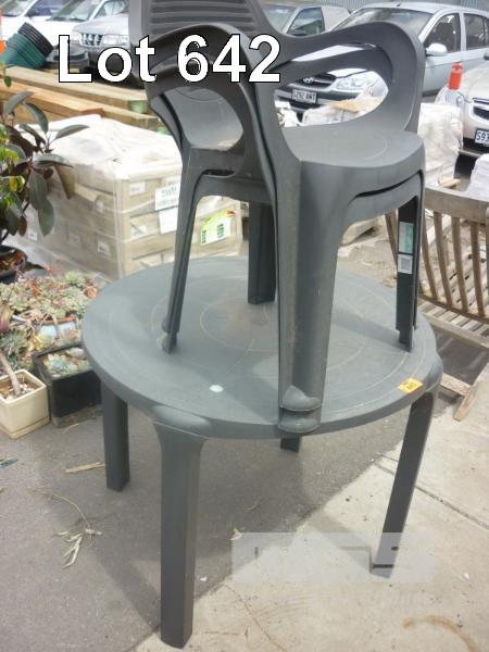 GREY PLASTIC, 3 PIECE OUTDOOR SETTING, INC; 2 X CHAIRS, 1 X ROUND TABLE