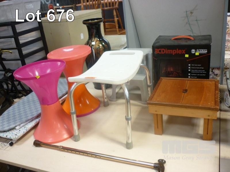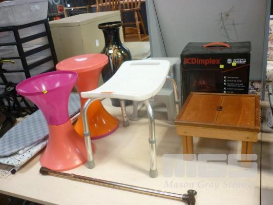 PLASTIC STOOLS, ELECTRIC HEATER, LARGE VASE, IRONING BOARDS ETC
