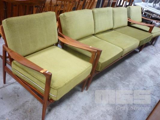 RETRO 3 PIECE LOUNGE SUITE, TIMBER FRAME, GREEN VELVET CUSHIONS, 3 SEATER & 2 x SINGLE