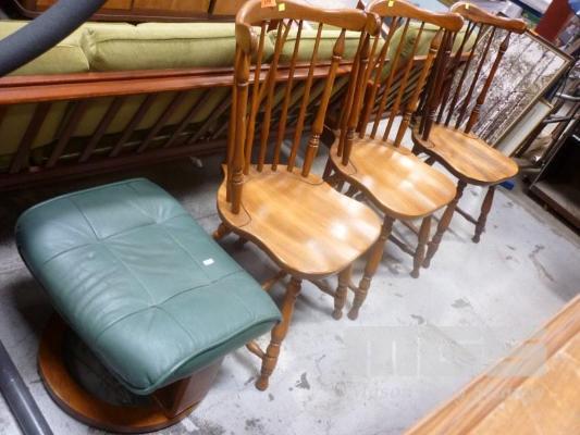 SET 3 x TIMBER DINING CHAIRS, SPINDLE BACK & TIMBER, GREEN LEATHER FOOT REST