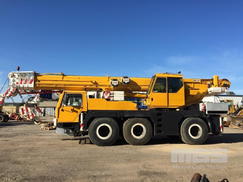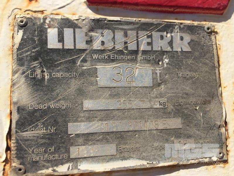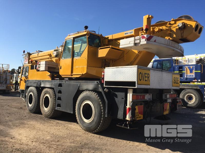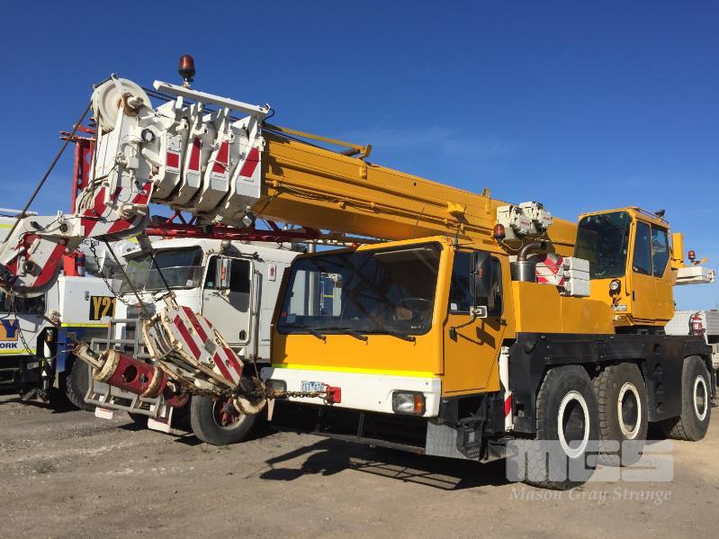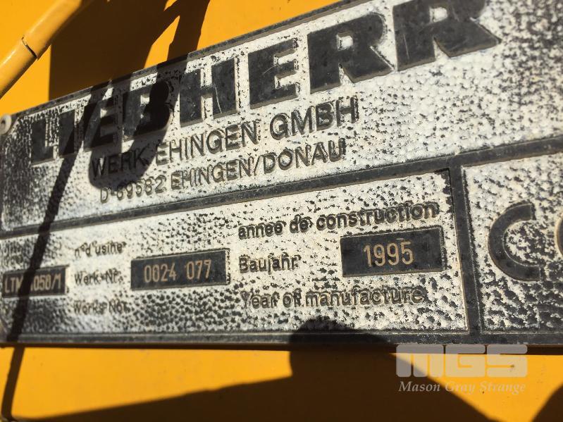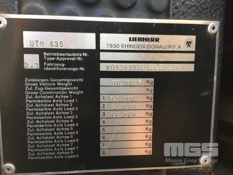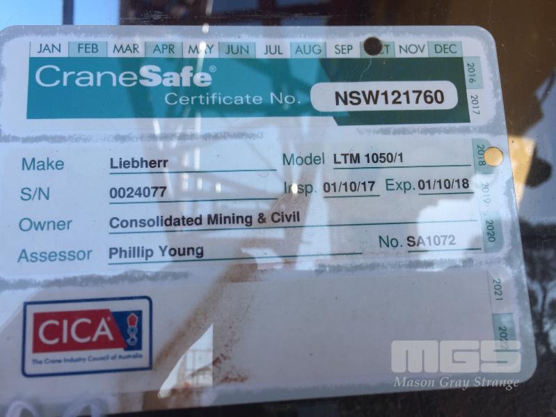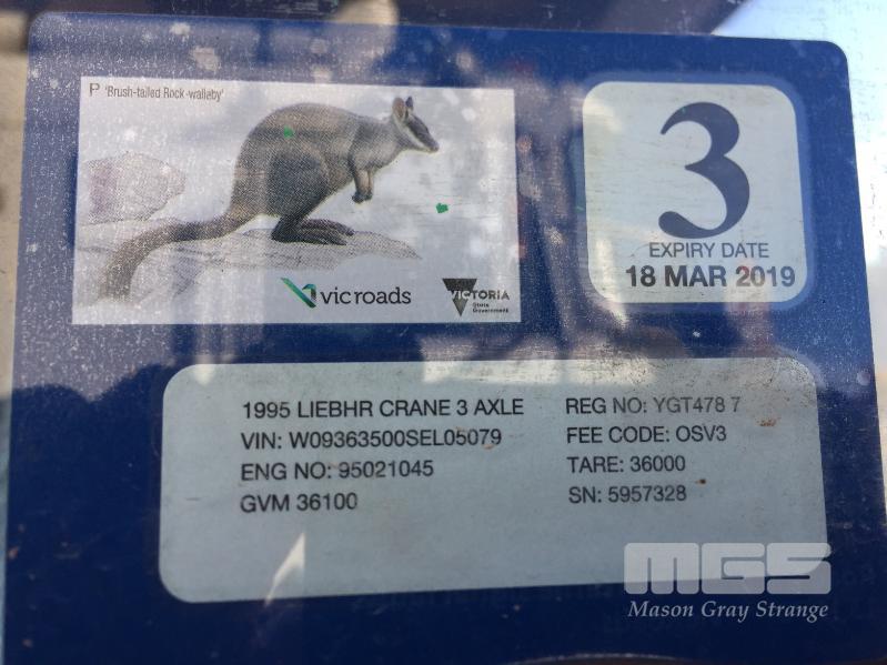 1995 LIEBHERR LTM1050/1 6x4 MOBILE CRANE REG: NO PLATES (VIC) VIN: W09363500SEL05079 ENG: 95021045 ODO: 97,425kms SHOWING GVM: 36,100kg 5 SPEED AUTOMATIC TRANSMISSION, YELLOW, 525/80R25 2 DOORS, 2 SEAT, CARRIER TYPE: UTM635 HOURS IN CRANE: 13,280 HOURS IN CAB: 19,441 S/NO: 0024077 LOAD CAPACITY: 50T FOLDING FLY JIB 1 x 32T 3 SHEAVE HOOK BLOCK 4 x HYDRAULIC OUTRIGGERS, BATTERY ISOLATION SWITCHES COUNTER WEIGHT: 1 x 2.2T, 1 x 2.1T, 1 x 2T, 1 x 1.9T, 1 x 1T & 1 x 500 10 YEAR INSPECTION DATE 12/2012 KEY #12 (NO PAPERS, WITH OWNER'S MANUAL, WITH SERVICE BOOKS)