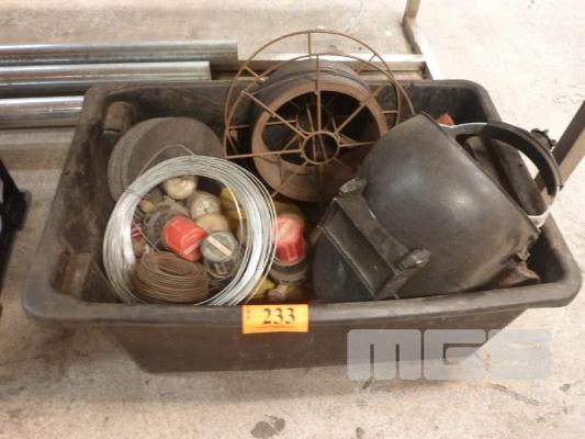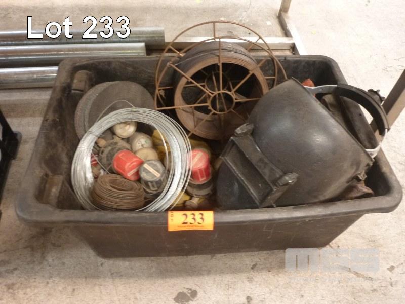 ASSORTED WELDING SUNDRIES INCLUDING OXY REGULATORS, WIRE, MASK, GRIND DISCS, ETC, 1 x TUB