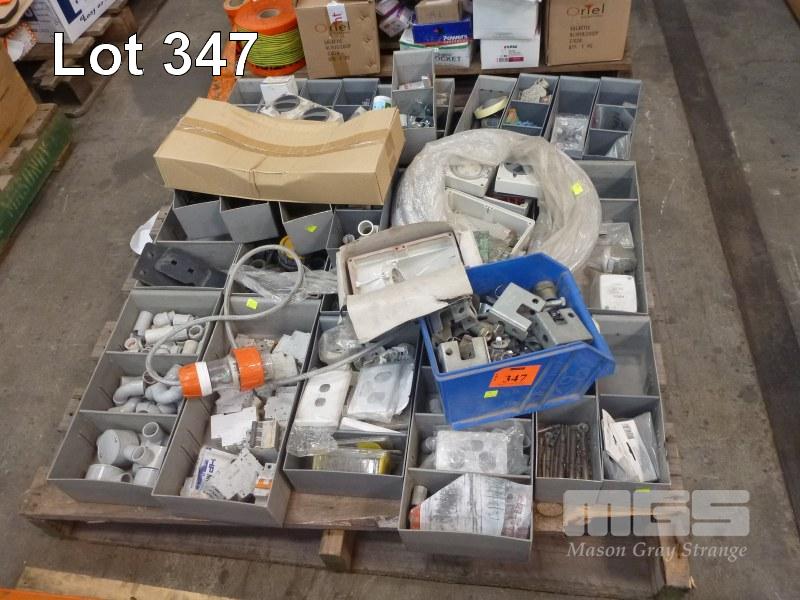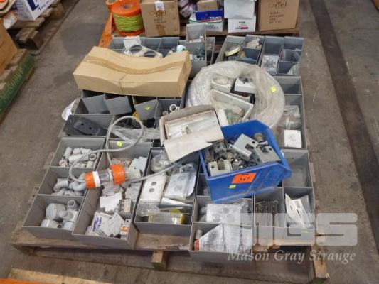 PARTS BINS & CONTENTS, ELECTRICAL, BREAKERS, FITTINGS, SWITCHES, HOUSINGS ETC (1 x PALLET)