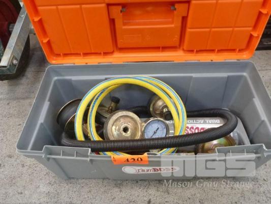 PRESSURE TEST KIT, DUAL ACTION PUMP GAUGE & ASSORTED BUNGS IN POLY TOOL BOX
