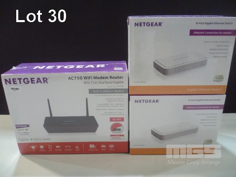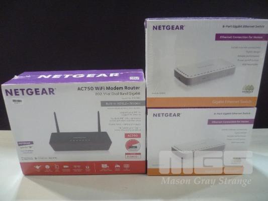 1 x NETGEAR D6000 AC750 DUAL-BAND GIGABIT WIFI MODEM ROUTER, D6000-100AU (NEW) 2 x NETGEAR GS608 8-PORT GIGABIT SWITCH, GS608AU (NEW)