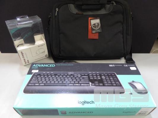 LOGITECH ADVANCED MK520R WIRELESS KEYBOARD & MOUSE, TARGUS 65W LAPTOP CHARGER, EVERKI ADVANCE 17.3" LAPTOP CARRY BAG