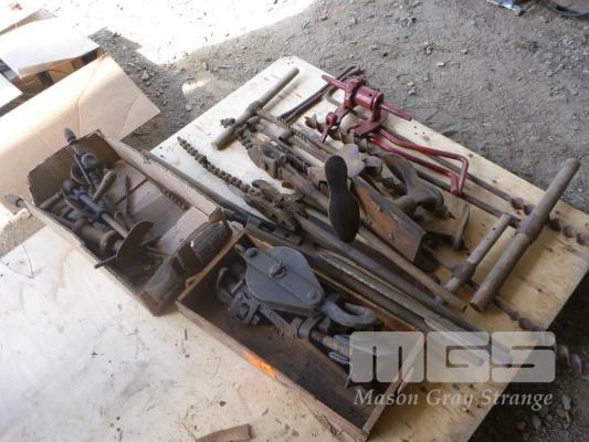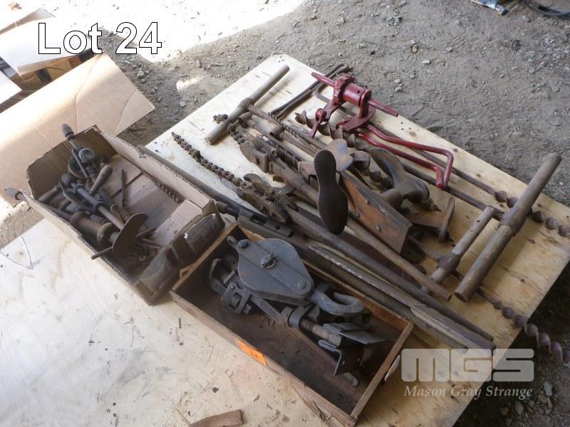 ASSORTED VINTAGE HAND TOOLS, PIPE WRENCHES, SHOE MAKING TOOLS, HAND DRILLS & TIMBER DRILLS