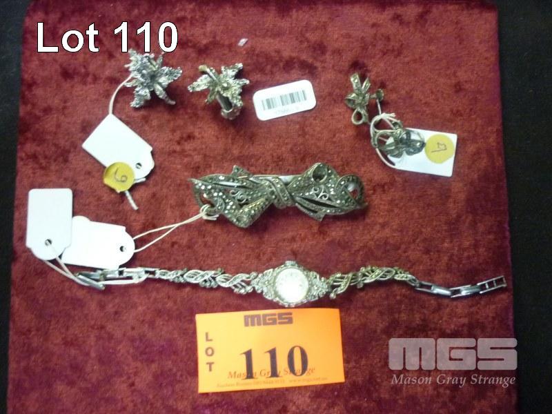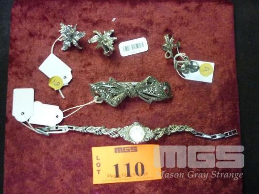 MARCASITE JEWELLERY, INC; 2 X PAIRS OF EARRINGS, BROOCH & WRIST WATCH