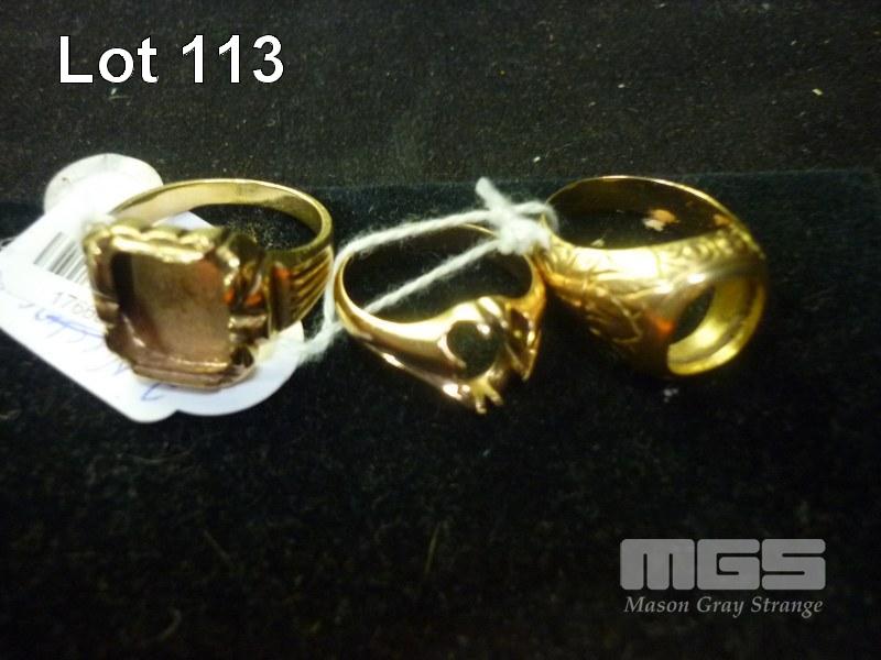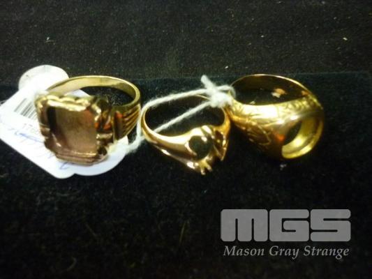 3 X GOLD RINGS, MISSING STONES, INC; 1 X MARKED 9CT, 1 X MARKED 15C & 1 X UNMARKED