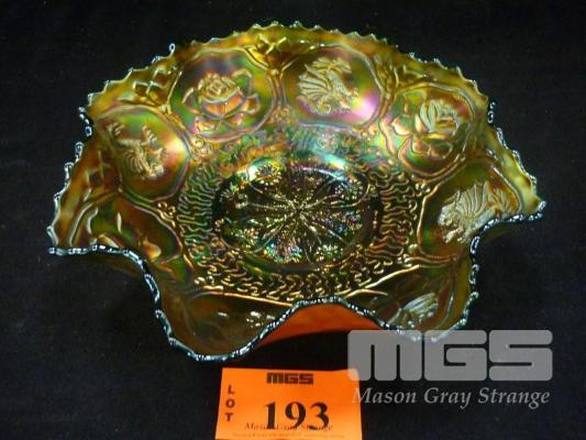 CARNIVAL GLASS BOWL DEPICTING DRAGONS & ROSES